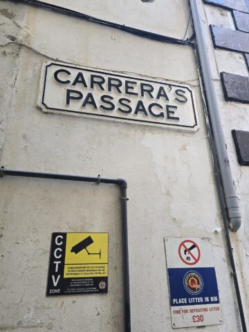 The name "Carrera’s Passage", according to the Gibraltar Government Ministry of Heritage website, likely refers not to an owner but to a tenant named Francis Carreras. “According to the 1816 Register of Inhabitants, Carreras, a tobacconist who had lived in Gibraltar for at least 15 years, resided at house No. 12 in Engineer Lane with his wife, Mary, and their two children, Mary and Frances. His tobacco shop appears to have been located on the south corner of Carrera’s Passage and Engineer Lane, while the family residence was on the third floor. The second floor housed a warehouse where tobacco bales were stored. These bales were hoisted using a derrick within the narrow passage entrance, likely giving the passage its name—Carrera’s Passage”.