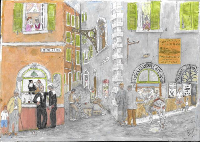 Every area of town as we have also learnt recently was different and offered their own characteristics – smells, sounds and looks. Carrera’s Passage, even if one stands at the entrance today looking in, remains very much unchanged – and easy to imagine what it must have been like 60 or 70 years ago. Housing hundreds of Gibraltarian families, this area as Gil depicts in his picture and with his many stories was a hive of activity day to day – and in the lives of many Gibraltarians.
