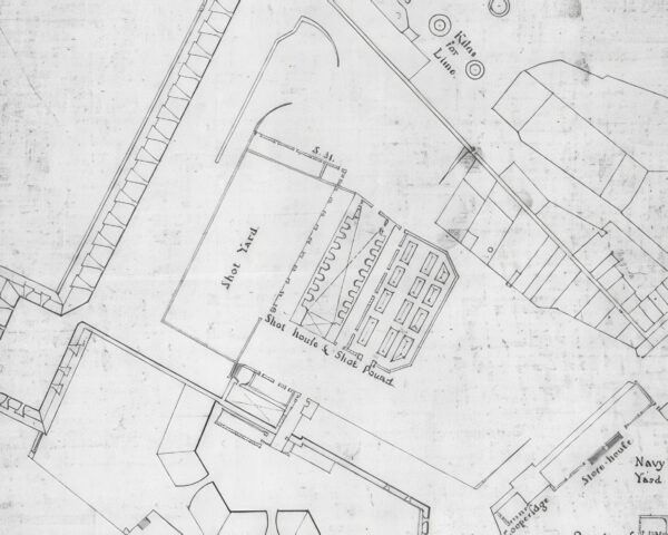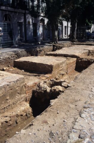 Using Bravo’s old plans and, above all, a detailed 1753 British map of the square, we chose a spot at the northern end, close to the Casemates Barracks built in 1817, for excavation. Bravo’s plan showed a long, arched building in this part of the square, but we had no idea what it was. The 1753 map also showed a long structure in the same spot, labelled the Shot House, and it included a row of square blocks running along the outside walls. Several eighteenth‑century writers mentioned this Shot House and also talked about a medieval atarazana in the square—but of course they were writing over four hundred years later so we could not ascertain the veracity of the claims.