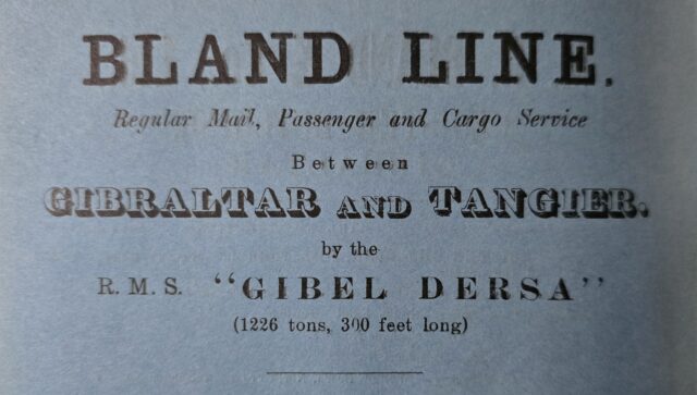 There was also a daily steam service in the day between Gibraltar and the town of Algeciras on the opposite side of the bay. Bland’s, in order to secure a direct link to the UK – the length of passage from London to Gibraltar was about four and a half days – combined the sailings of the weekly steamers where they were able to work a direct service between the UK and Morocco via Gibraltar.