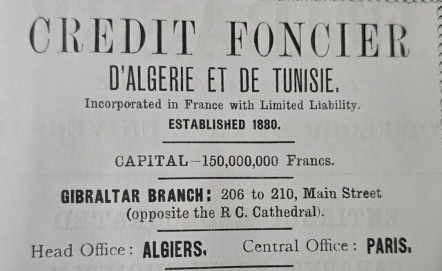 There were four private banks in Gibraltar100 years ago – Barclays Bank, Credit Foncier d'Algerie et de Tunisie (with its head office in Algiers). The A.L. Galliano of Gibraltar and Rugeroni Bros and Co. of Gibraltar.
