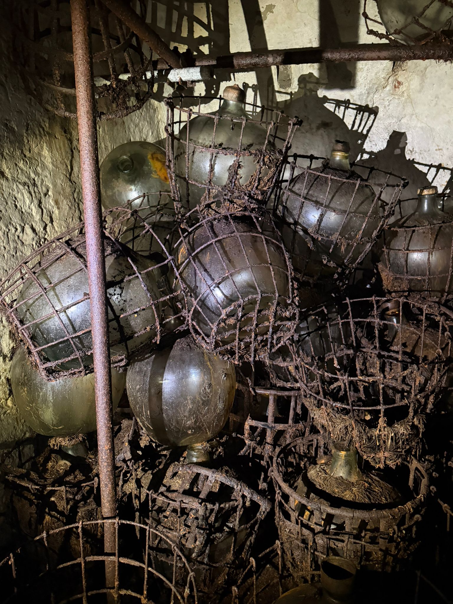 Inside the chamber, workers encountered numerous large glass vessels, likely demijohns or carboys, many still held in protective iron cages and arranged in clusters.