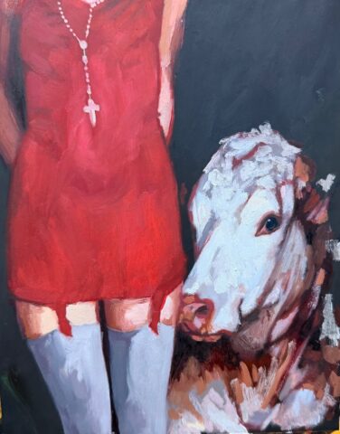 For Mr Ullger, Silk & Sacrifice is a painting that juxtaposes innocence, vulnerability and sacrifice through a carefully constructed visual tension between the human figure and the calf.