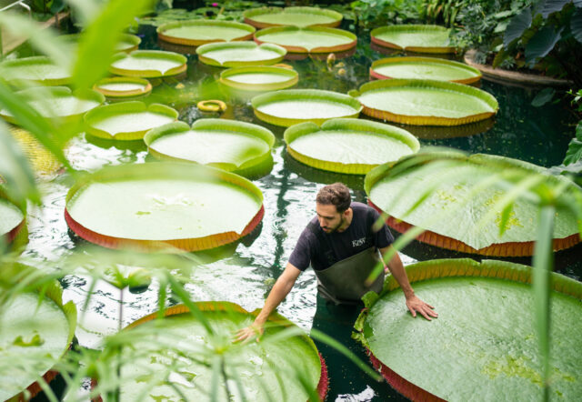 Botanical Horticulturalist Alberto Trinco with an upturned leaf from Kew Garden's giant water lilies Victoria Amazonica which are the world's largest water lily species, as the Royal Botanic Gardens Kew, in Richmond, London, celebrates another Guinness World Records title, the largest living plant collection on earth.