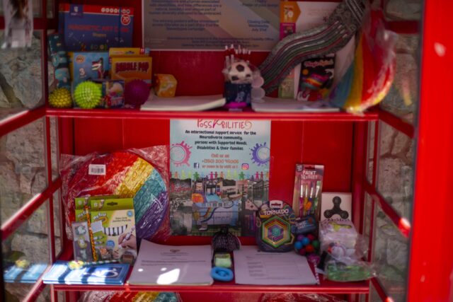 This telephone box hosts posters with information on local support groups and charities, information on how the Supported Needs and Disability Office can support you, and some sensory items that you can take home with you.