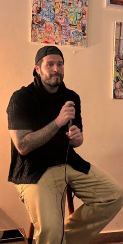 Jonathan Teuma welcomed the audience, which included family, fans, friends and poetry performers. Both poets took turns on the mic for three short sets each, which could be called a ‘mano a mano’, however seasoned artists and firm friends that they are, both downplayed any rivalry and fed off each other’s contributions at the microphone.