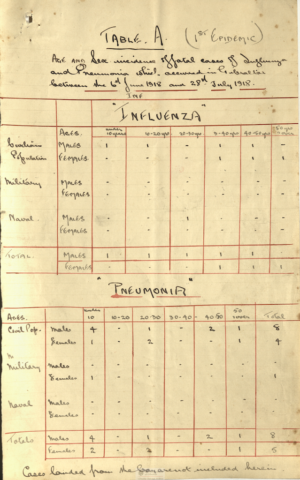 The MOH stated that over 30% of the total civilian population suffered from influenza in some form or other. Between June and November he recorded deaths from influenza as separate from pneumonia but assuming that the pneumonias to have been secondary to influenza we can estimate death rates. During this time there were a total of 220 deaths of which 100 were civilian, 10 naval, 23 military and 87 were shipping cases. The MOH estimated the total deaths from flu and pneumonia in the civilian population at 100, which, for the estimated civilian population of 16549, gave a death rate of approximately 6 per 1000 or 0.6%.