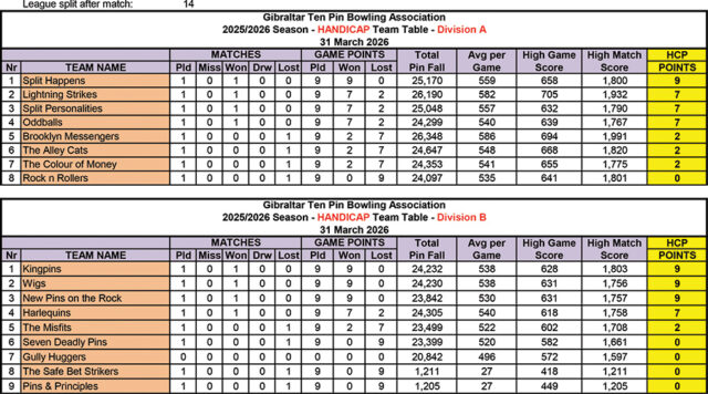 The early standings reflect a competitive start to the second half. In the A League, Split Happens lead the way on 9 points following their perfect result. Lightning Strikes sit second on 7 points, just ahead of Split Personalities, who are level on points but trail on pin count.