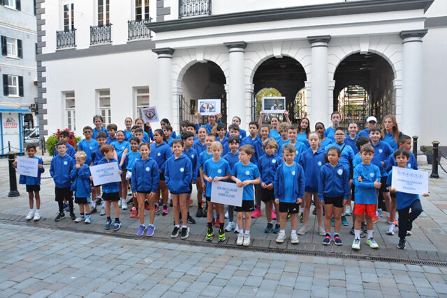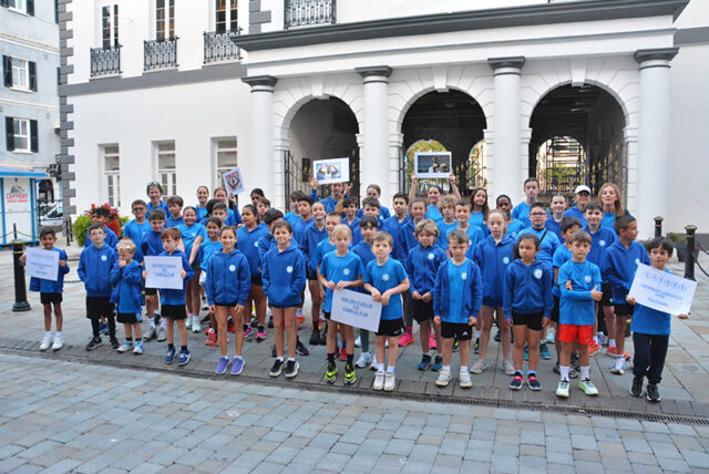 The youngsters, mainly from Lourdians Athletics Club, gathered just outside the archways of the Gibraltar Parliament building, where Sir Mo stopped to greet them and organise them to join him for the final stretch of his Round the Rock charity run.